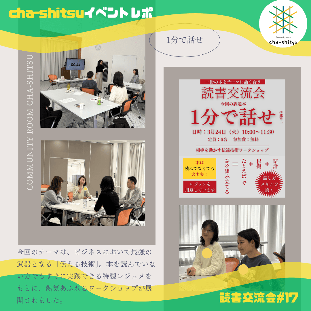 2026年3月24日、Community room cha-shitsuにて、ベストセラー『1分で話せ』(伊藤羊一 著)をテーマにした、第17回読書交流会を開催いたしました。