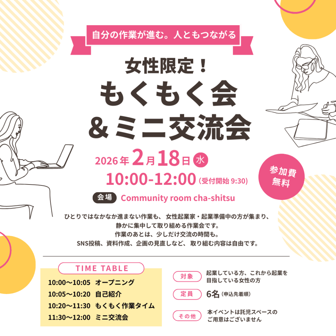 【2/18イベント開催】女性限定!もくもく会&ミニ交流会