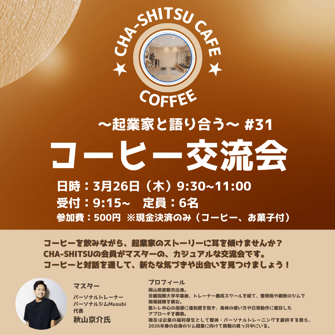 今回のコーヒー交流会は、パーソナルジム「Musubi」代表の秋山京介さんをマスターにお迎えします!