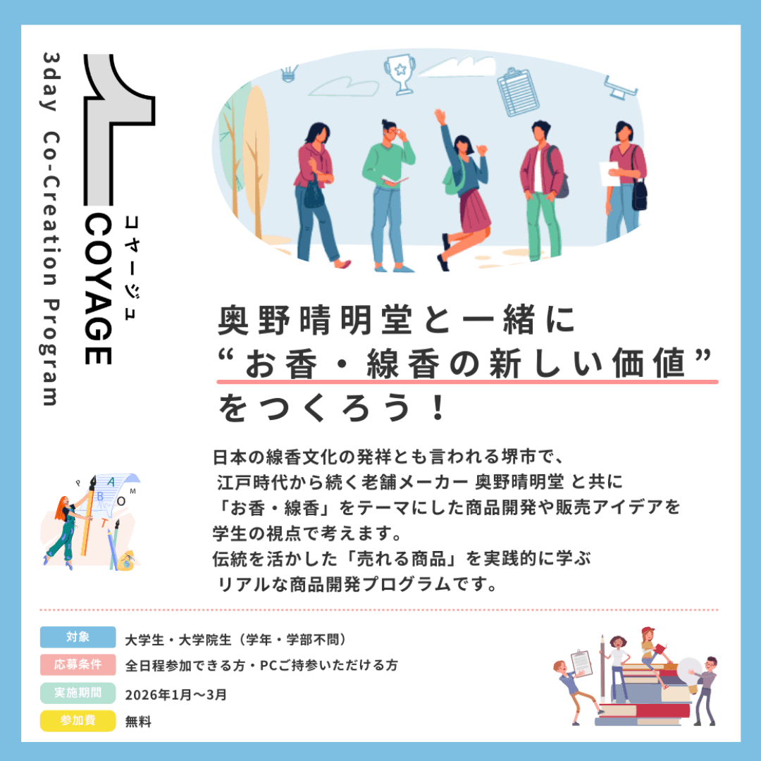 日本の線香文化の発祥とも言われる堺市で、江戸時代から続く老舗メーカー 奥野晴明堂 と共に、商品開発・販売アイデアを学生の視点で考えます。