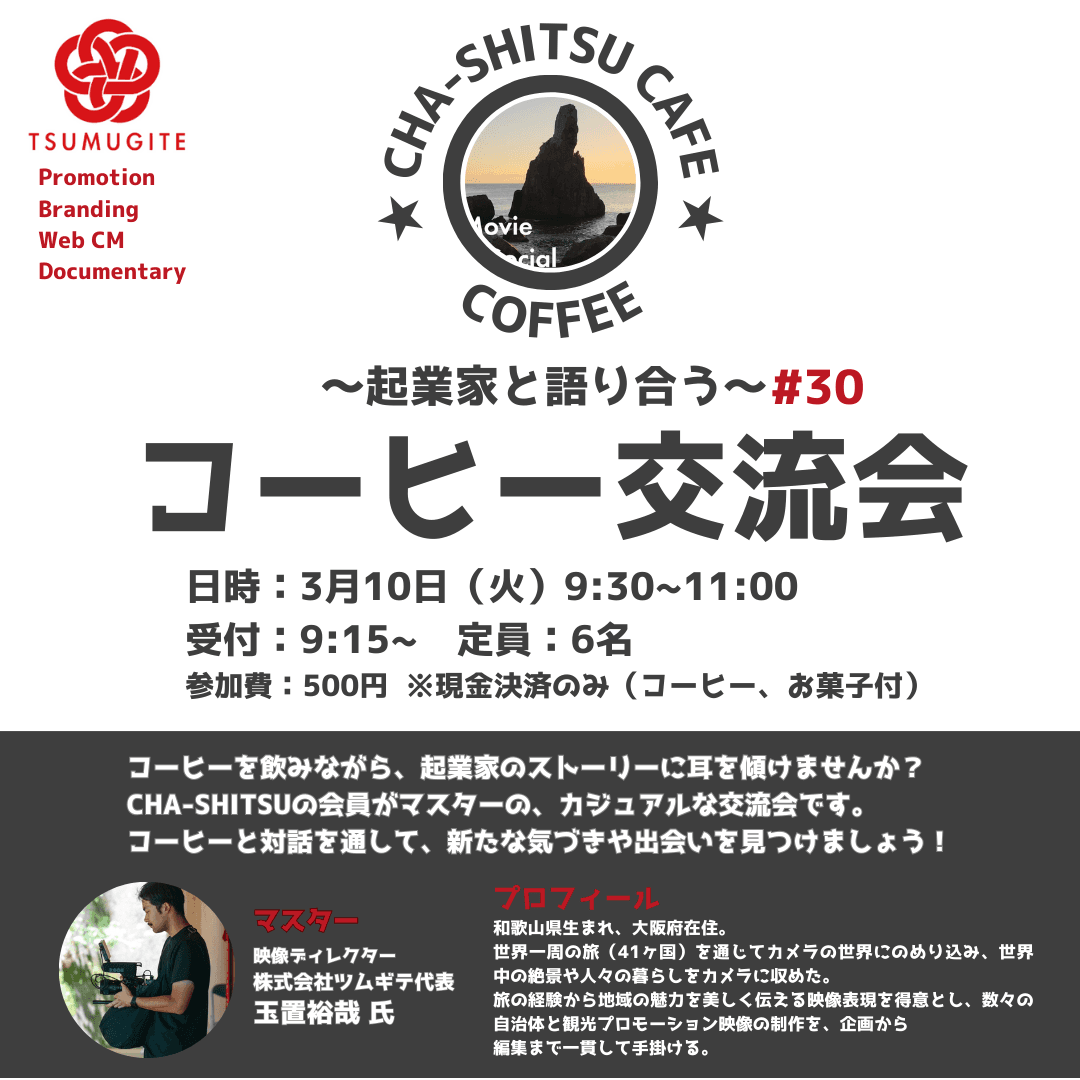 今回のコーヒー交流会は、映像制作会社「ツムギテ」代表の玉置裕哉さんをマスターにお迎えします!