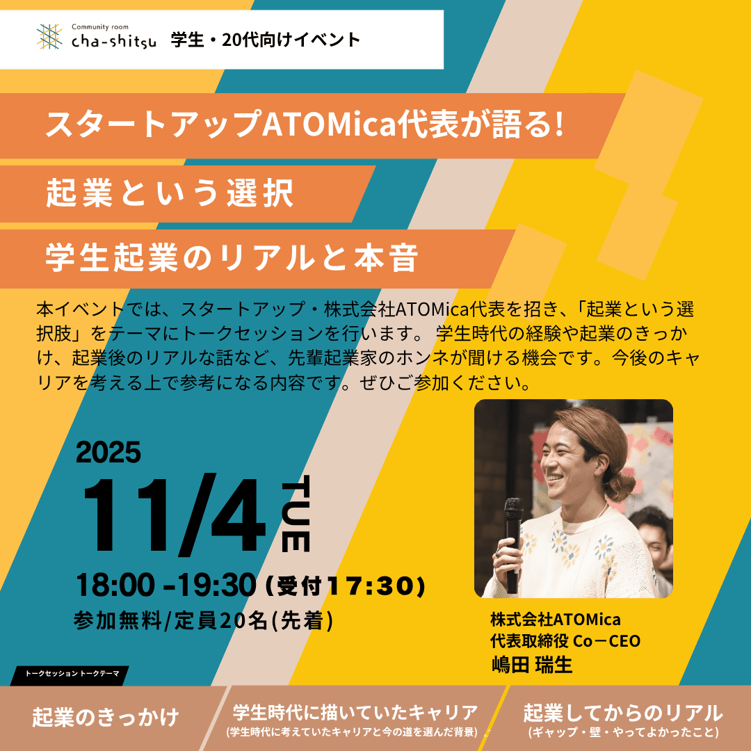 【11/4イベント開催】学生・20代向けイベント 〜人見知りの学生がCEOへ “人と人が出会う仕組みをつくるまでのお話”〜